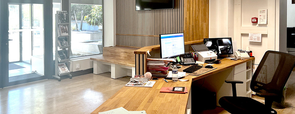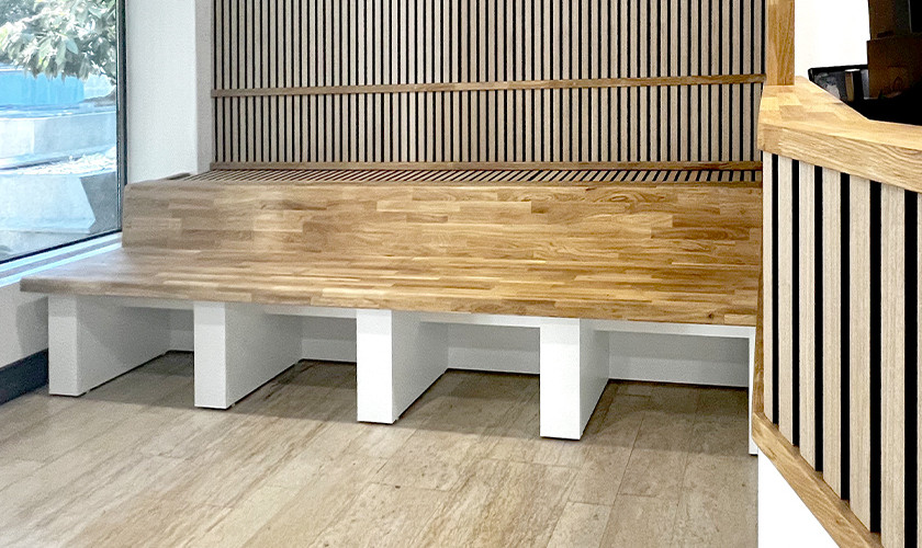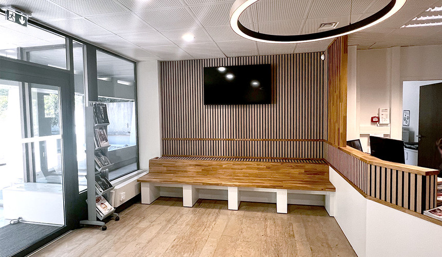 Création d'une banquette autour du système de chauffage avec un habillage mural dans la continuité de la banque d'accueil et de son claustra.
