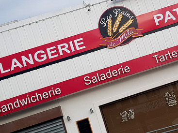 Fabrication et pose d'enseigne pour Cegecom : tôles pliées et thermolaquées, vinyle teinté masse pour une tenue optimale puis pose de l'ensemble à la boulangerie : Les pains de Mila