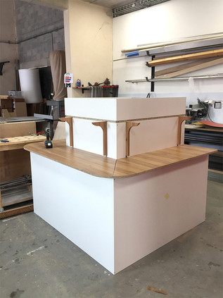 Meuble de self service conçu pour masquer un pilier tout en ajoutant un élément fonctionnel à l'espace du restaurant Sogeres chez Sanofi à Aramon.